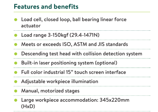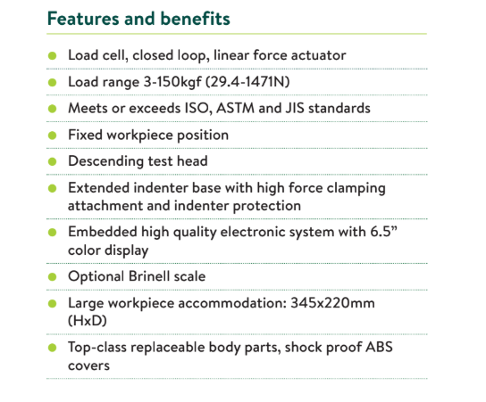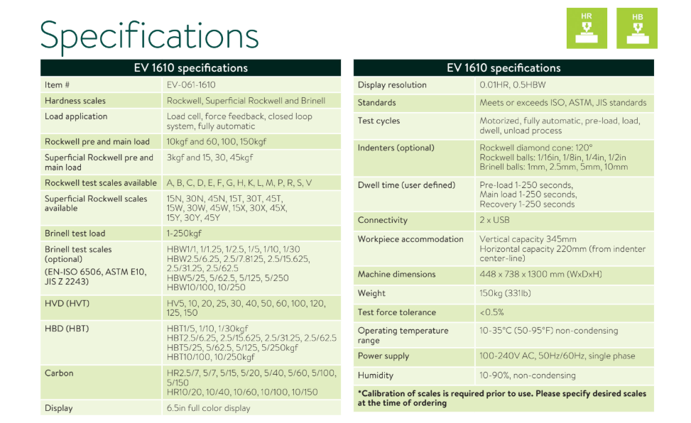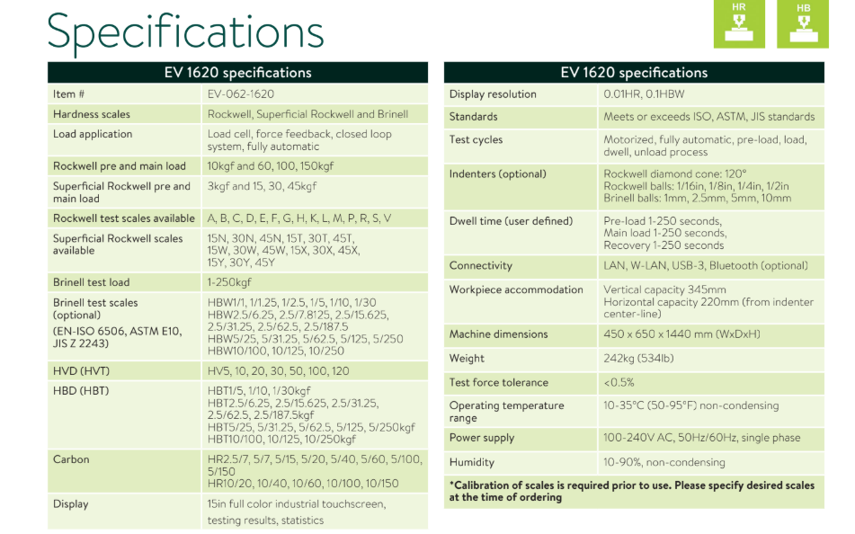 The Evotech 1610 and 1620 are fully automatic, servo-driven hardness testers with force feedback load cells. Both systems support Rockwell, Superficial Rockwell, Low Load Brinell Testing and handle workpieces up to 345 × 220mm. The 1610 features a 6.5” color display, while the 1620 adds a 15” touchscreen, Windows 10 system, SSD storage, automatic measurement, and motorized head with collision detection.
