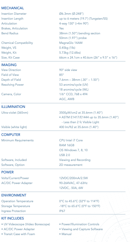 With lengths up to 6 meters and 4-way articulation, the UVU Videoscope System from ITI has been specially designed to enable easy access into hard-to-reach areas in order to identify fluorescent magnetic particle and dye penetrant indications.